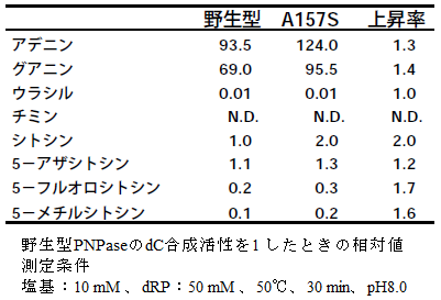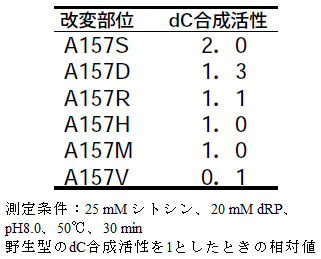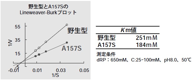 157位をセリン以外のアミノ酸に置換したところ、セリンのみで顕著な活性向上が見られ、バリンでは活性が大きく低下することがわかった (表1)。また、Lineweaver-Burk プロットからシトシンに対するKm値は、天然型で251 mM、A157S変異酵素で184 mMとわずかに小さくなっていた (図10)。また、dAやdGの合成活性も同時に向上していることがわかった。シトシンアナログには一様に活性が見られたが、5位に置換基が入ったものは活性が低かった。ウリジンやチミジンに対しては殆んど活性が見られなかった (表2)。