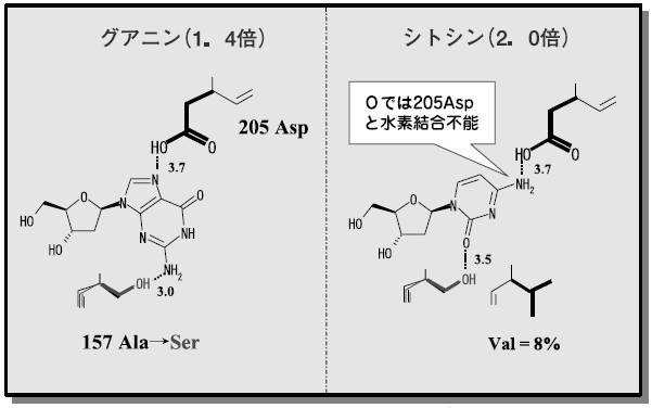 これら知見と、PNPaseの立体構造データ9)およびすでに提案されているPNPaseの反応機構を10)もとに157位の置換効果を解析した。計算から求めたPNPaseとdCの結合モデルと157位の位置関係を図11 に示した。PNPaseの反応では、205位のアスパラギン酸とプリン塩基の7位の窒素との水素結合が重要とされている。205位のアスパラギン酸は、シトシンの反応においても4位のアミノ基と水素結合を形成すると考えられる。ウラシルやチミンは4位がカルボニル基であることから水素結合を形成できず、反応性が低いと考えられる。157位のアラニンがセリンに置換されると、シトシンの2位のカルボニルとの距離が3.5Å程度になると計算され、水素結合が形成され得る距離になる。この相互作用により、シトシンが反応性の高まる配置に誘導されると解釈すると、157位がバリンに置換されると活性が低下することに納得がいく (図12)。