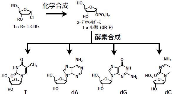 クロロ糖 (図4化合物1a) を原料として化学的に1位をリン酸化することで、4種のデオキシヌクレオシドの共通原料となるdRPを合成する方法を検討した。
