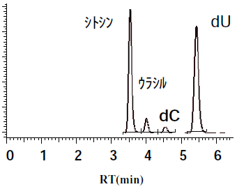 あるとき、dAやdGの合成検討に用いていた大腸菌由来PNPaseを高発現させた大腸菌をスクリーニングにかけてみたところ、極微量ながらdCが生成することを見出した (図6)。再現性を確認すると、なぜか冷蔵庫で長期保管した菌体を触媒としたときだけdCが生成することがわかった。フレッシュな菌を用いた場合は、生成物としてウラシルやデオキシウリジン (dU) だけが検出された。