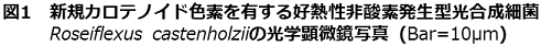 実際、これらの戦略を組み合わせて用いることにより、高次分類階級レベル (科、目、綱、亜門等) で系統的に新規な細菌の分離に成功している (図1)。例えば、非酸素発生型光合成を行う新規好熱性繊維状光合成細菌Roseiflexus castenholzii (図1) は温泉中の微生物被膜から、シアノバクテリアとの共培養により増殖に成功し、後に純粋分離されたものである3)。この細菌に関しては新属新種としての提案しかなされていないが、十分に新科または新目の提案が可能な系統分類学的新規性を持つものである。また、硫黄を大量に含む温泉水の白色ミクロバイアル・マットから単離された新規硫酸還元細菌Thermodesulfobium narugense はいずれの既存硫酸還元細菌とも系統的に隔たっており、その新属新種提案では、同時に新科Thermodesulfobiaceaeを提案した4)。また、高温嫌気リアクターと温泉からそれぞれ分離された繊維状細菌、Anaerolinea thermophila, Caldilinea aerophilaは新属新種としての提案しかなされていないが、いずれも亜門レベルでの新規性が認められているものである5)。