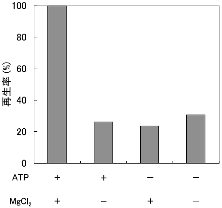 生体内でフォールディングを補助するタンパク質である分子シャペロンは、生体外においてもその効果を持つことが知られている。中でもよく研究されている分子シャペロンの一つであるGroELは、分子量57000のサブユニット7つからなるリング状の巨大タンパク質複合体が二つ重なった14量体構造を取ることで、タンパク質のフォールディングを補助するナノスケールの空洞を形成している15)。GroELは工業的に用いるにはまだ非常に高価であるので、少量を有効に用いる手段を開発することが重要である。逆ミセルは微量の水中でリフォールディングが可能であることから、バルク水中で用いるよりも少量のGroELでその効果を得ることが期待できる。そこで、AOT系において、ATP、MgCl2、GroELを溶解した緩衝液を、界面活性剤を含むイソオクタン溶液に添加する微量注入法により、GroEL内包逆ミセル溶液を調製し、固液抽出法により固体変性RNase Aを可溶化した16)。GroELを添加することによって、大幅なRNase A再生率の向上が確認され、逆ミセル内でGroELがフォールディングを効率的に補助していることが示された。また、GroELのフォールディング補助効果を誘引するための必須因子 (ATP、MgCl2) のいずれが欠損しても、この補助効果が見られないことから (図6)、GroELはバルク水中と同様の機能を逆ミセル中でも発現しているものと考えられる。