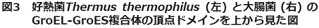 上で述べたGroEL-GroES複合体は空洞内に基質蛋白質を含まない「空」の構造である。では、空洞内に基質蛋白質が含まれているときにシャペロニンの立体構造はどうなるのであろうか?好熱菌Thermus thermophilus のGroEL-GroES複合体は非常に安定なので、細胞内での基質蛋白質を閉じ込めたままの複合体を精製できる13)。すなわち、細胞内で空洞に基質蛋白質を詰め込んだままのシャペロニン複合体が精製できるのである (ちなみに大腸菌のGroEL、GroESはすぐに解離する。結晶構造がわかっているGroELGroES複合体はADP存在下で再構成させたものである8)。この好熱菌シャペロニンの立体構造を決めたところ、興味深いことにGroESが結合しているGroELの頂上ドメインだけが大きく歪んでいて、特徴的な七回対称から大きく崩れていることがわかった12)(図3)。基質となる変性蛋白質がシャペロニンの構造・機能にどのように影響を及ぼすかは今後の大きな課題である。