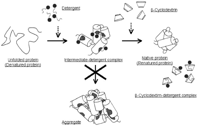 1995年、Gellmanらによって、二種類の低分子量化合物を順次添加することにより、分子シャペロン様のリフォールディング促進効果が見られることが発見され、この手法は、Artificial Chaperone-Assisted refolding (ACA) 法と名付けられた21)。ACA法では、まず、界面活性剤を添加することによってリフォールディング中間体の凝集を抑制し、次に、界面活性剤のホスト化合物の添加によりタンパク質表面から迅速に界面活性剤を除去し、リフォールディングを開始する (図2)。一方、生体内では、大腸菌の場合、分子シャペロンの一つであるDnaKが、DnaJと伴にフォールディング中間体タンパク質の疎水性表面に強く結合し、凝集を阻害する。その後、GrpEタンパク質によって、この複合体が解離し、適切なフォールディングが開始されることが知られている22)。つまり、ACA法は、複合体形成による凝集阻害とその後の複合体の解離という二つの役割を、それぞれ低分子量化合物によって再現し、大腸菌のDnaK-DnaJ-GrpEシステムを模倣しているというわけである。
