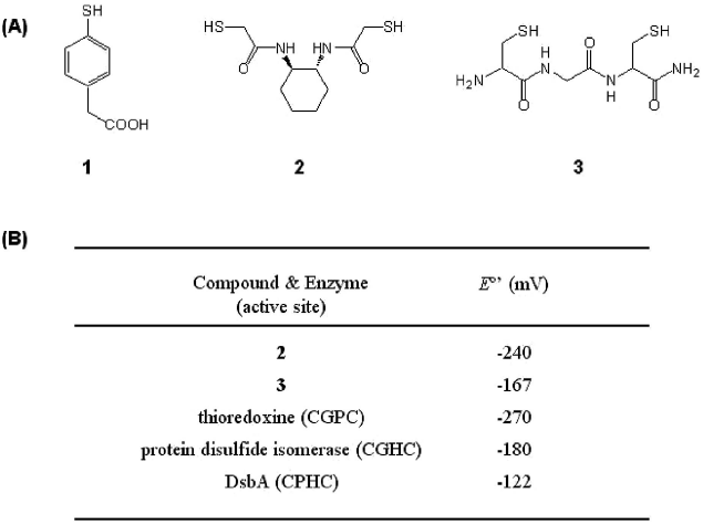 フォールダーゼを模倣した研究として、S-S交換反応を促進するジスルフィドイソメラーゼ (PDI) 様の機能を有した低分子量化合物が研究・開発されてきた。Leesらは、PDIの活性中心にあるチオール基のpKaに着目した研究を行った30)。PDIの活性中心にあるCXXCモチーフのチオール基のうち、溶液中に露出しているチオール基は、pKaが低く (pKa =6.7)、基質タンパク質のS-S結合に対する求核性が高いことが知られている。そこで、システインらの脂肪族チオールよりもpKaが低い芳香族チオール (図3 化合物1) を開発し、変性還元リボヌクレア-ゼAのリフォールディングに添加剤として用いた。その結果、S-S交換反応速度が速くなり、リフォールディング速度が大きく向上することを報告した。一方、Rainesらは、生体内においてタンパク質の酸化還元反応を触媒している酵素群の酸化還元電位に着目し、適切な電位を有する低分子量化合物 (図3 化合物2) およびペプチド (図3 化合物3) を、S-S交換促進試薬として開発した31)。これらの化合物を添加したところ、従来の酸化還元試薬を添加した場合と比較して、変性還元リボヌクレア-ゼAのリフォールディング収率は向上することが示された。