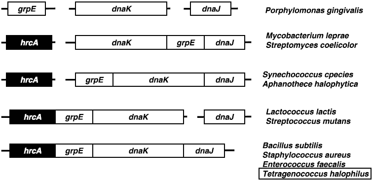 筆者らはこれまでに、T. halophilusから細菌の代表的な分子シャペロンであるdnaKおよびgroEL遺伝子のクローニング、およびその近傍の遺伝子解析を行った (図1)。いずれも他種グラム陽性細菌と同様、その近傍の遺伝子構造も類似しておりdnaKの上流にはリプレッサータンパク質遺伝子hrcA(heat regulation at CIRCE) およびgrpE、下流にはdnaJに高い相同性を示すopen reading frameの存在が確認された (図2)。groELに関しては、その上流にgroESに高い相同性を示すopen reading frameが存在した。これらの遺伝子はいずれもEnterococcus属由来のものと最も高い相同性を示した。また、hrcA上流に2つ、groES上流に1つのCIRCE (Controlling Inverted Repeat of Chaperone Expression) 配列が見出され、他種グラム陽性細菌の分子シャペロン同様、HrcA/CIRCEシステム (クラスⅠ型レギュロン、表2) による遺伝子発現制御の存在が示唆された (図3)。さらに最近では、DnaKと協調して働くことで凝集体のリフォールディングを促進するHSP104/ClpBという分子シャペロンの遺伝子クローニングと塩基配列の決定を行った。その結果、T. halophilus clpBはdnaK、groELと同様にEnterococcus属が保持するclpBと最も高い相同性を示した。また、プロモーター領域の塩基配列の比較より、この遺伝子はDnaK、GroELオペロンとは異なり、リプレッサータンパク質CtsR (class three stress gene repressor、クラスⅢ型レギュロン、表2) によって遺伝子発現が制御されていることが推定された (図4)。乳酸菌や枯草菌などのグラム陽性細菌では、このCtsRがClpファミリーに属するATP依存性プロテアーゼをコードする遺伝子の上流に位置するプロモーター領域に結合して、転写を負に制御することが明らかとなっている10,11)。
