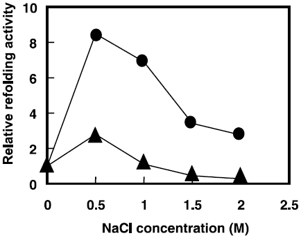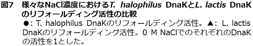 我々は、in vitroでのT. halophilus Dnakの機能を解析するために、dnaK遺伝子をpET発現ベクターに組込み、大腸菌を形質転換した。大腸菌内で大量発現させたDnaKを精製し、尿素で変性した乳酸脱水素酵素を基質として様々な塩ストレス条件下においてリフォールディング活性を測定した。その結果、非耐塩性乳酸菌Lactococcus lactissubsp. lactis由来のDnaKと比較して高塩ストレス条件下において高いリフォールディング活性を示した (図7)9)。現在、DnaKと同様に精製した組換え体DnaJ、GrpEを用いて高塩濃度下でのシャペロン活性を検討しており、高塩濃度下でも効率的に変性タンパク質を再生できるシャペロンシステムの構築をめざしている。