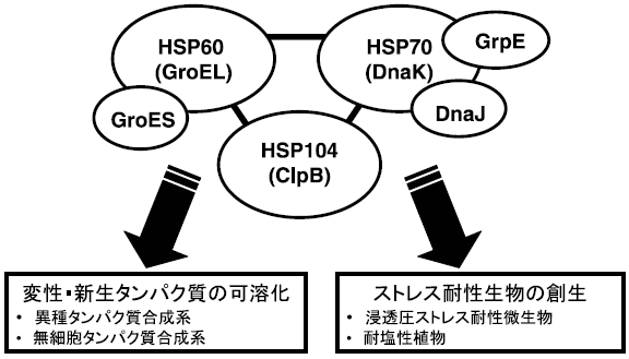 第二に、耐塩性・浸透圧ストレス耐性生物の創生への応用である。穀物生産においては、人口爆発と地球環境の破壊による食糧不足を解決するために砂漠や塩類集積土壌などの未耕地土壌の利用と環境ストレスに抵抗性のある植物の作出が必要である。一方、微生物による発酵生産において究極の最適化がなされている現在では、過剰な基質濃度と高濃度の最終生産物によるストレスが発酵生産の限界を生んでいる。浸透圧ストレス耐性遺伝子を導入することでそれら発酵に関わる物質耐性を向上させることができれば、生産性の限界を超えることが可能であると考えられる。古来より発酵食品の製造に利用され、安全性・無害性が実証されている耐塩性乳酸菌の分子シャペロンは、耐塩性植物や浸透圧ストレス耐性微生物の創生へ応用できると期待している。