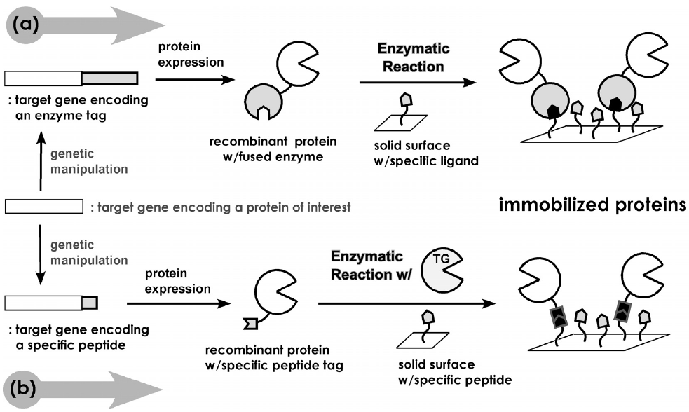 一方、タンパク質の固定化に酵素反応を利用しようとする興味深い試みもある。酵素反応の特徴である穏和な条件下での厳密な基質特異性を利用すれば、目的タンパク質の機能を損なうことなく、部位特異的な固定化が可能となる。Johnssonらは、DNA修復系で働くヒト由来O6-アルキルグアニン・アルキル転移酵素 (hAGT, 207aa) を利用している22)。hAGTは、O6-アルキルグアニンのアルキル基を自身のチオール基に転移させる反応を触媒する。彼らは、この反応の不可逆性に着目し、目的タンパク質をhAGTとの融合タンパク質として発現させ、O6-ベンジルグアニン誘導体で表面修飾された固相に加えることで、hAGT部位特異的な固定化に成功している。Mrksichらは、セリンエステラーゼの一種であるCutinase (Cut, 199 aa) がホスホン酸エステルとの反応により不可逆的に失活することを利用し、目的タンパク質をCutとの融合タンパク質として発現させ、ホスホン酸エステルが表面修飾された固相と組み合わせることで、Cut 活性部位のSer残基 (Ser120) 特異的な固定化を達成している23)。これらの手法は、酵素反応における不可逆的な阻害反応に着目しており、酵素そのものをタグとして利用した点で新規な手法であるが、タグのサイズは共に20 kDa程度とかなり大きい (図4(a))。