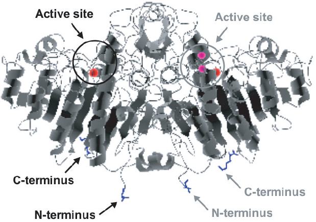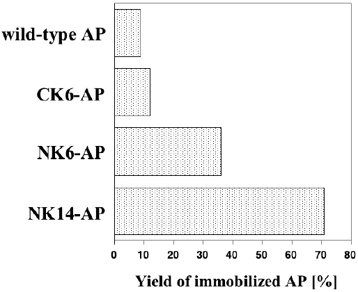 最近、筆者らは、Gln残基とLys残基の側鎖を共有結合的に架橋化するトランスグルタミナーゼ (TG) を利用したタンパク質固定化法を提案している24,25)。これまで、TGを用いたタンパク質固定化法はいくつか報告されているが、すべてnative酵素が用いられており、その形態は包括型26,27)か、あるいは適当な担体に物理吸着させた後、架橋化処理を施す手法28,29)が取られていた。そこで筆者らは、TGのペプチドタグ選択的タンパク質架橋化能力30)をより積極的に活用するため、TGの基質ペプチドを目的タンパク質のNあるいはC末端に導入することにより、導入ペプチドを介した共有結合的固定化を試みた (図4(b))。大腸菌由来のアルカリホスファターゼ31) (AP,図5) をモデルとした検討においては、反応性Lys残基を含む僅か6残基からなるペプチドタグ (MKHKGS) をN末端に付加し、反応性Gln残基に富む基質タンパク質であるカゼインにより表面修飾を施した担体を調製することで、ペプチドタグ特異的なAPの固定化が可能であった24,25)。TGを利用する共有結合的固定化法は、前述のペプチドタグを利用する利点と、酵素反応を利用する利点とを併せ持つ点で、既往の手法に勝ると考えている。本手法をさらに発展させるためには、TGの基質認識に最適なペプチド配列の取得と、その導入部位の最適化が必須であるが、最近、後者が固定化効率に大きな影響を与えることを見出している (図6)。また、TGはLys残基の代わりに様々な1級アミンも基質として認識するため、本固定化法は極めて汎用性の高い技術になる可能性を秘めている。