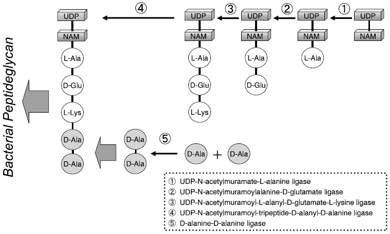 D-Alanine-D-alanine ligase (Ddl) は、遊離のD-Ala 2分子を連結する反応を触媒し、微生物のペプチドグリカン合成に関わる重要な酵素として細菌に広く存在している (図1)。因みにバンコマイシンは、細菌 (とくにグラム陽性菌) のこの特性に着目して開発された有望な院内感染菌MRSA対応抗菌剤である。すなわち、バンコマイシンはD-alanyl- D-alanine に特異的に結合して細胞壁 (ペプチドグリカン) 構成成分に構造変化を引き起こし、これが細胞壁の一部として取り込まれるのを阻害することにより抗菌活性を示す。ところが、バンコマイシンに対して耐性を獲得した腸球菌 (VRE) では、D-alanyl-D-alanineがD-alanyl-D-lactate (乳酸塩) に変化したためにバンコマイシンは結合できず抗菌活性を失うことが知られている。これは、VRE由来のDdlが基質としてD-lactateを認識するように変化したからであり、当該変異DdlはD-ala-D-Ser合成活性を触媒することも報告されている5)。Buggらは6)、変異型Ddlの一つであるVanAの基質特異性を詳細に検討し、生成するジペプチドのC末端側にD-NorLeucine, D-NorValine, D-Met, D-Pheが連結されることをTLC分析レベルで示している。またコントロールとした大腸菌由来のDdlでもD-MetやD-PheがD-Alaに連結され、D-Ala-D-MetとD-Ala-D-Pheが合成されることを報告している。さらに、これらDdl変異体の解析の一環として大腸菌由来のDdlBを対象とした部位特異的変異導入がParkらによって検討されている。DdlBの立体構造とVanAの配列情報から2ヶ所の変異導入部位 (Y216, S150) を決定し、これら変異酵素がD-lactateをN末端もしくはC末端に連結する活性を有することを速度論的なパラメータを用いて検証している7)。