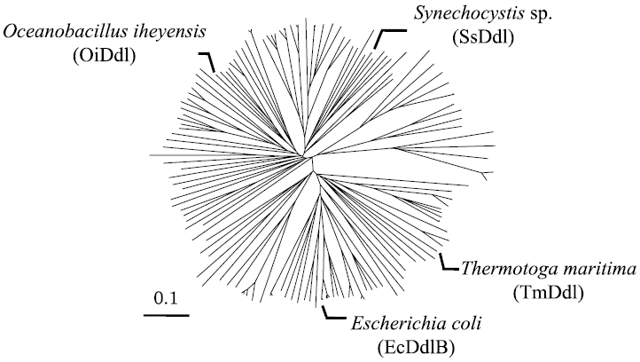 Ddlの進化系統樹 (図2) の結果を踏まえて、ゲノムが公開されている微生物からEscherichia coli K 12 (EcDdlB)、Oceanobacillus iheyensis JCM 11309 (OiDdl)、Synechocystis sp. PCC 6803 (SsDdl)、Thermotoga maritima ATCC 43589 (TmDdl) の4種類の微生物を選択し、そのddl をクローニングの対象とした。