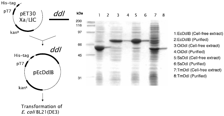 これらのゲノムDNAを鋳型としたPCRによりddlをそれぞれ増幅し、pET30 Xa/LICに連結したプラスミドをE. coli BL 21 (DE3) に導入して、ddl高発現組換え株を作成した。SDS-PAGEの結果から、いずれもHisタグ融合タンパク質として可溶性発現することが確認され、Ni2+アフィニティークロマトグラフィーおよび脱塩処理を施したサンプルを精製酵素として以下の検討に用いた (図3)。