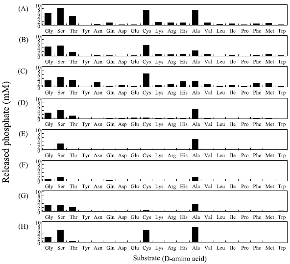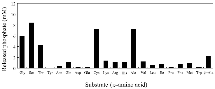 37℃での反応ではD-Ala、D-Ser、D-Thr、D-Cys、Glyだけが基質となり得たが (図4)、図6に示すように60℃の反応ではD-Gln、D-Lys、D-Arg、D-His、D-Val、D-Leu、D-Ile、D-Phe、D-Met、β-Alaに関しても基質となり得ることを示唆する有意なリン酸の遊離が確認された。しかしながら、37℃での反応で良好な基質であった5種類のアミノ酸を基質とした場合のリン酸の遊離量は他のアミノ酸を基質とした場合に比較して圧倒的に多いことから、60℃での反応による基質特異性の広がりは、活性化エネルギーの増大による反応速度の上昇に起因し、酵素と基質の親和性が変化したことによるものではないと推察している。