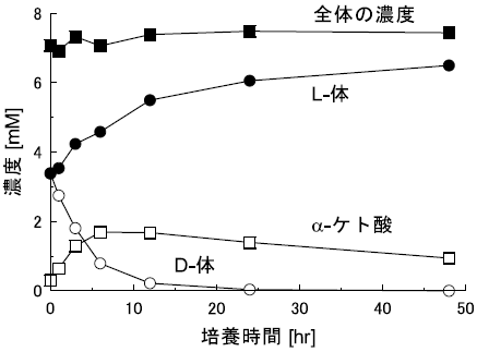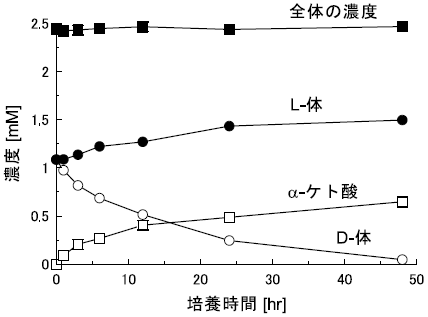 S. melilotiに対して4-クロロフェニルアラニンを作用させた際の経時変化を追跡した (図8)。反応中、α-ケト酸とアミノ酸の濃度の和はほとんど変化がないにもかかわらず、D体濃度は低下し、それに代わってL体濃度が上昇することが分かる。またα-ケト酸濃度の一時的な上昇も確認されたことから、中間体としてα-ケト酸を経由していると考えた。実際、α-ケト酸を基質とした場合には、反応の進行にしたがって濃度は低下し、それに伴ってL体のアミノ酸濃度が上昇することを確認している。