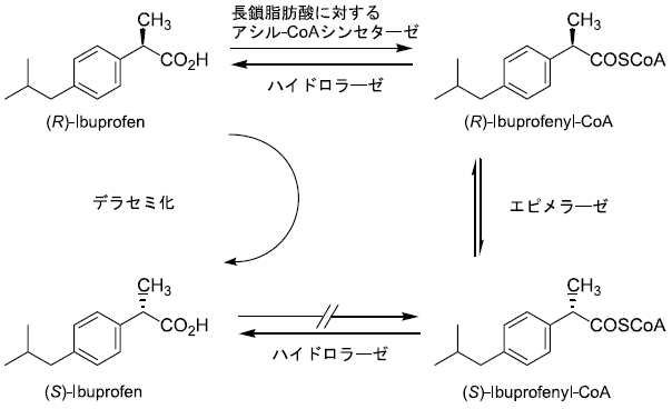 α-メチルカルボン酸に対するデラセミ化反応としてはこれまでいくつかの報告例がある。R体あるいはラセミ体をS体の2-アリールプロパン酸へと変換する生体触媒としてCordyceps militaris3)やラット肝臓抽出物4)が知られている。S体は非ステロイド系抗炎症剤として用いられる。特にラットの場合には反応機構も推定されている (図2)。反応は3段階からなっている。即ち、長鎖脂肪酸に対して作用するアシル-CoAシンセターゼによるチオエステル化、エピメリ化およびチオエステル部分の加水分解である。これらの中でチオエステル化の段階が立体選択的であるため、反応の進行と共に系中の鏡像体比は徐々に一方へと偏っていく。