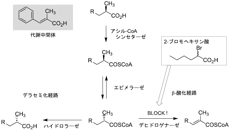 しかし、全菌体を用いているため、いくつかの化合物では代謝反応が進行してしまった。そこで、副反応を抑制しデラセミ化反応を優先させる条件の検討を行った7)。例えば2-メチル-3-フェニルプロパン酸は完全に代謝され安息香酸に変換された。その生成経路として脂肪酸のβ-酸化を考えた (図4)。その理由としては全菌体での反応の際、中鎖脂肪酸や安息香酸を添加するとデラセミ化反応が阻害されたこと、また破砕上清を用いて反応を進行させるためには補因子としてATP, CoASH, Mg2+が必要であり、チオエステル体を経由していると予想されたことである。2-メチルカルボン酸のβ-酸化ではメチル基が結合している炭素の立体配置がS の場合のみ代謝をうけるため、エピメリ化酵素が作用することが知られている8)。つまりR体のα-メチンプロトンは引き抜かれ、逆側からプロトンを受け取ることによって立体が反転する。ここで、2-PPAのα-メチンプロトンを重水素化した化合物に対してデラセミ化反応を行うと、その重水素化率は反応の進行と共に低下していくことが分かった。つまりデラセミ化の過程においてもエピメリ化の段階が存在したのである。このことからデラセミ化とβ-酸化は一部共通の反応を利用していると仮定し、それぞれの経路への分かれ道はα, β-不飽和化の段階であると考えた。つまり、エピメリ化酵素の働きによって立体反転を受けた後、速やかにチオエステルが加水分解されればデラセミ化が優先することとなるが、加水分解よりもα, β-不飽和化の方が早いとβ-酸化が進行することとなる。よってα, β-不飽和化酵素を阻害すればデラセミ化が優先すると考えた。そこでα, β-不飽和化を触媒する酵素、アシル-CoAデヒドロゲナーゼの阻害剤である2-ブロモヘキサン酸9)を反応系中に添加し、全菌体にて2-メチル-3-フェニルプロパン酸を作用させた。種々検討の結果、添加濃度を1.2 mMとした際にデラセミ化反応を優先させることができた (71%, 88%ee)。このことから、デラセミ化反応は脂肪酸の代謝経路のひとつであるβ-酸化経路の一部を利用していることが明らかとなった。