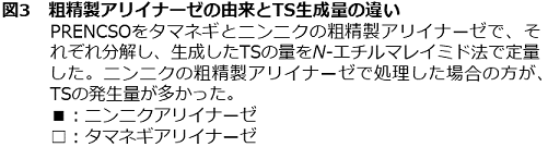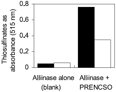 モデル系を用いた色素の誘導では、一定量のPRENCSO、アリイン、アミノ酸の混合液に、一定の活性を持つアリイナーゼを加えれば、決まった量の色素が誘導されるはずである。しかし、同じ強さのアリイナーゼ活性を示す粗酵素液でも、それがニンニク由来である場合は、タマネギ由来である場合より、色素の誘導量が多かった。そこで、PRENCSOをそれぞれのアリイナーゼの粗酵素液で処理し、生成するTSの量を比較した。どちらの場合もPRENCSOのほとんどは分解されて、残っていなかったが、色素の誘導量と同じく、ニンニク由来の場合の方がTSの生成量が多いと言う予想外の結果が得られた (図3)。そこで我々は次に、この粗精製のアリイナーゼについて研究を行うことにした。