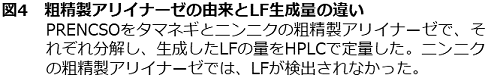 図1に示すように、PRENCSOをアリイナーゼで分解すると、PSAからLFとTSが生成すると報告されていた。PRENCSOがどちらの粗精製のアリイナーゼによっても充分に分解されているにも拘らず、TSの生成量に違いがあったので、次に我々はもう一つの反応生成物であるLFの量を比較した。その結果、PRENCSOをタマネギ由来の粗酵素で分解すると、LFが生成するが、ニンニク由来の粗酵素で分解すると生成しないことに気付いた。また、タマネギ由来でも、精製したアリイナーゼでPRENCSOを分解すると、LFが生成しなくなることを確認した (図4)。
