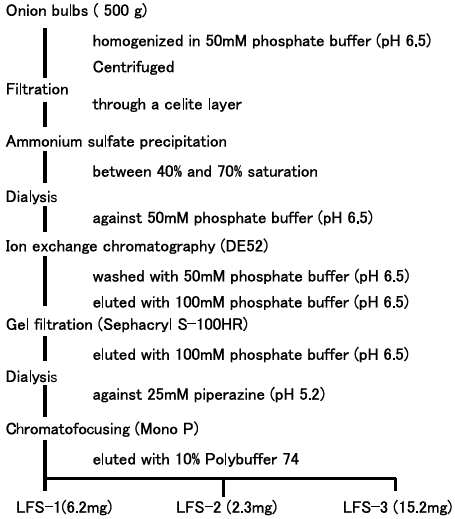 粗精製のタマネギアリイナーゼ中に含まれる、LFの生成に必須な成分を精製するため、我々は、まずLFを生成させる活性の測定法を考案した。この測定方法は、単独ではPRENCSOからLFを生成しないニンニクアリイナーゼ (精製品) と検定サンプル (タマネギ由来の粗精製のアリイナーゼ溶液を分画した試料) を混合した後、PRENCSOを加えて室温で3分間反応させ、生成したLFをHPLCで定量するというものであり、定量性と再現性に優れていた。さらに考案したLF生成活性を指標にし、図5に示した精製方法を用いて、3種類のタンパク質を活性成分として単離した。また、3種類の活性成分の分子量は、17,000~18,000 であることをTOF MS分析により確認し、分子量の小さい方から順にLFS-1, LFS-2, LFS-3と命名した。