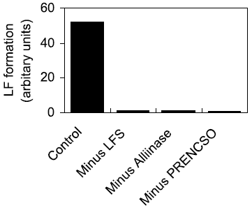 組換え体のLFS-3と精製アリイナーゼ、および精製したPRENCSOの3者を混合すると、LFが生成するが、この3成分のうちどれか1成分でも欠けると、LFは生成しなくなった (図6)。このことから、LFSは、PRENCSOからのLFの生成に必須な成分の一つであることが確認できた6)。次に、この3成分の反応順序を明らかにするため、限外ろ過膜を使用した実験を行った結果、予想通り、PRENCSOがアリイナーゼによって分解されて生じた分子量5,000 以下の成分にLFSが作用することによってLFが生成することが確かめられた。さらに、PRENCSOとアリイナーゼを反応させてから、LFSを作用させるまでの時間を長くすると、LFの生成量が減少した。これらの結果から、LFSの基質は、反応性が高く、不安定なPSAであることが強く示唆された。