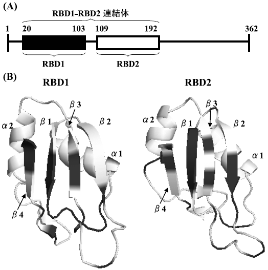 まず、各RBDについて、NMRを用いて立体構造の解析を行った。RBD1およびRBD2について15N 標識されたサンプルを調製し、NOESYやTOCSYといったNMR測定を行った。NOESYでは空間的に距離が近い (5 Å以内) 水素原子間においてシグナルを得ることができる。一方、TOCSYにおいては、化学結合を介した水素原子間においてシグナルを得ることができる。このような特徴を基に、水素原子間の距離情報や二面角情報を抽出していき、構造解析に利用した。両ドメインの立体構造は、反平行型のβシートが2本のαへリックスによって裏打ちされた、RNP型に特徴的なフォールドを示していた3,4)(図1)。つまり、RBD1とRBD2は基本的には、よく似たフォールドを保持しており、立体構造の面からだけでは、両ドメイン間のRNA結合能の違いを見出すことはできなかった。そこで我々は、各RBDについて標的RNAとの相互作用領域を特定し、その領域における物性を詳細に解析することにした。