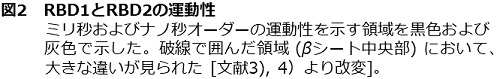 mMSIの各RBDについて、緩和時間等の測定を行い、モデルフリー解析を行ったところ、以下のようなことがわかった。まず、RBD1については、βシート中央部において、ミリ秒およびナノ秒オーダーの内部運動が存在していた。一方、RBD2のβシート中央部には、そのような運動は検出されなかった (図2)。βシートの中央部には、両ドメインともに3つのPHE残基によって形成された疎水パッチ構造が形成されており、RNA塩基の認識に重要な役割を担っていることが知られている。このような相互作用領域における運動性は、標的RNAを認識する上で重要な役割を果たすと考えられる。実際に、mMSIと同様なRNP型のRNA結合タンパク質であるAUF1タンパク質やU1Aタンパク質のRBDは、タンパク質単体時には、相互作用領域において、ミリ秒オーダーの運動性を有していた7,8)。しかし、標的核酸と結合して複合体を形成すると、その運動性は抑えられていた。このことから、相互作用領域における運動性は、誘導適合を引き起こして標的核酸との強固な結合を生み出していると考えられる。mMSIのRBD1にみられる相互作用領域の運動性も、標的RNAの認識に有利に働いている可能性がある。