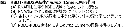 今回の実験では、RBD1-RBD2連結体に対して、numb 15merをモル比で1:0, 1:0.2, 1:0.5, 1:1, 1:1.5および1:2となるように滴定していった。RBD1-RBD2連結体のRBD1領域においては、1:0から1:0.5において大きく化学シフトが変化していた。しかし、それ以上RNAを加えても、化学シフトに変化がみられなかった (図3A)。一方で、RBD2領域においては、1:0から1:0.5までRNAを加えていっても、化学シフトにほとんど変化がみられなかった。しかし、さらにRNAを加え、モル比が1:1になると、急にシグナルが移動し、大きな化学シフト変化を示していた (図3B)。RBD1-RBD2連結体に対してnumb 15merが少ない状態 (1:0~1:0.5) では、RBD2領域がRNAに結合する前に、他のRBD1-RBD2連結体分子のRBD1領域が、結合してしまったと考えられる。そのため、RBD2領域はRNAとの相互作用に関与することができず、化学シフトに変化がみられなかったと考えられる。これはおそらく、RBD1の結合後さらにRBD2も結合するには、何らかの構造変化が必要で、しかもこの構造変化にはある程度の時間が必要とされるために生じた現象だと考えられる。一方で、RBD1-RBD2連結体に対してnumb 15mer が等量もしくはそれ以上存在している状態では (1:1~1:2), numb15mer中の結合配列がRBD1領域で占拠されることがないため、RBD2領域もnumb 15merに結合することができ、化学シフトに変化がみられたと考えられる (図3C)。
