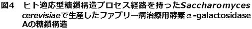 出芽酵母Saccharomyces cerevisiaeは、hypermannosylation化した糖鎖となるので、このプロセスに関わる遺伝子 (OCH1, MNN1) をノックアウトした変異体を作成することが必要である。産総研の地神らのグループは、och1 mnn1をベースに、哺乳類由来糖鎖修飾遺伝子を導入し、ヒト適応型糖鎖付加機能を持った酵母宿主を開発した7)。また、och1 mnn1酵母を用いてファブリー病の治療薬となる組換えα-galactosidase Aを生産した。この酵素の場合、糖鎖にマンノース-6-リン酸残基 (Man-P-) を有することが重要である。出芽酵母S. cerevisiae はマンノース-6-リン酸残基を付加する能力を持つので、組換え酵素にうまくマンノース-6-リン酸残基を付加できた (図4)8)。