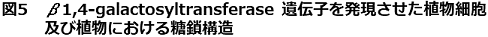 一方、植物のN-結合型糖鎖においても、糖鎖付加機能のヒト型化が試みられている。植物糖鎖の非還元末端には、N-アセチルグルコサミン残基が存在するものの、β1,4-結合したガラクトース残基が存在しない (微量ながらβ1,3-結合したガラクトース残基が存在する)17)。そこで、動物由来のβ1,4-galactosyltransferase遺伝子を導入すると、β1,4-結合したガラクトース残基を持つ糖タンパク質を合成できると期待できる。我々のグループはヒト由来β1,4-galactosyltransferase遺伝子をタバコBY2培養細胞に導入し、糖鎖構造を改変することに成功した (図5)18)。ガラクトース残基が付加した糖鎖が47%に達した。また、興味深いことに、植物特有であるであるキシロース残基やフコース残基が付加した糖鎖の含量が劇的に減少した。β1,4-galactosyltransferase遺伝子を導入することで、細胞内糖鎖付加機構に影響を与えたことになる。オランダのWageningenのグループ19)は、タバコ植物体でβ1,4-galactosyltransferase遺伝子を発現させ、さらに抗体遺伝子を導入して生産させた (図5)。この抗体の糖鎖には、ガラクトース残基が付加していたが、キシロース残基やフコース残基もが付加しており、植物培養細胞とは異なった。