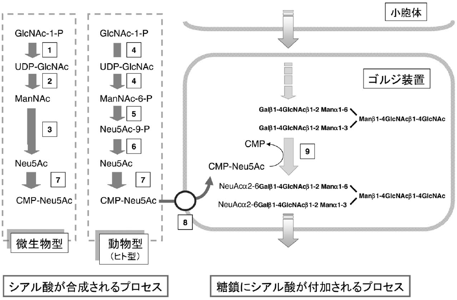 昆虫細胞では、米国のJarvisやBetenbaughらのグループが、ヒトとほぼ同じ糖鎖付加機能を持った宿主開発を精力的に行った10-13)。この宿主MimicTM Sf9は、昆虫細胞での組換えタンパク質生産に汎用されているSpodoptera frugiperda由来Sf9細胞をベースに、哺乳類の糖鎖修飾関連遺伝子を導入したもの14)で、現在市販されている。導入された遺伝子は5つで、N-acetylglucosaminyltransferase-I, N-acetylglucosaminyltransferase-II、β1,4-galactosyltransferaseや2種のsialyltransferaseである (図1酵素2から4)。ウマ由来黄体形成ホルモン/絨毛性ゴナドトロピンを生産させると、N-アセチルノイラミン酸 (NeuAc、シアル酸) は付加されていなかった15)。Sf9細胞はシアル酸合成能を持たないためCMP-NeuAcを合成できず、導入した2種のsialyltransferaseの基質が存在しないためであった (後述)。