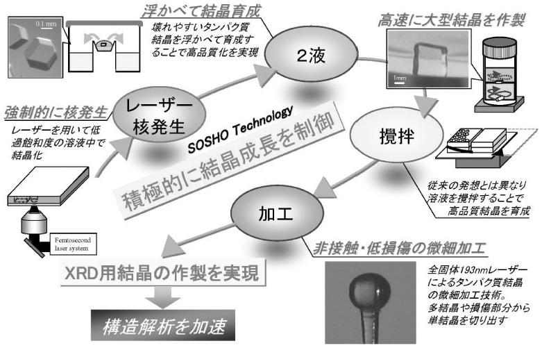 最新の創薬研究は、病気に関連するタンパク質分子の立体構造情報に基づき、医薬候補化合物の設計を行う。原子レベルの分解能を有するタンパク質分子の詳細な立体構造の多くは、X線回折による結晶構造解析によって明らかとなる。そのため、まずタンパク質の結晶化が必要となる。