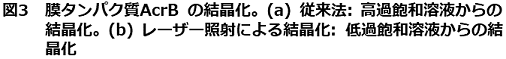 LIGHTはこの壁をいとも簡単に打ち破った。結晶化剤として用いていたポリエチレングリコールの濃度を下げた低過飽和溶液にレーザーを照射した。未照射の溶液からは結晶が析出しなかったが、レーザー照射した溶液からは結晶の析出を観測できた。得られたAcrB結晶のX線回折測定の分解能は2.3 Åであった (図3b)11)。低過飽和溶液中で結晶の核形成と成長の2つを制御できたことが劇的な品質の向上につながった。