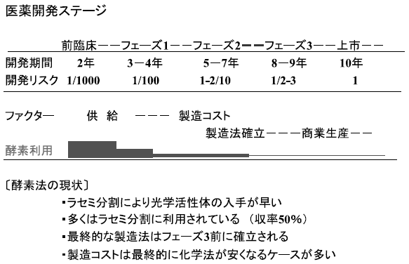 医薬品製造を例に考えてみると、一般に医薬品の開発ステージは図3のようになっている。フェーズ2が始まるまでは化合物の供給時間が最重要課題とある。すなわち、短時間で光学活性体を得る手段としての酵素によるラセミ分割が多く検討され、いち早く目的とする光学活性体を得ることに専念されることが多い。しかし、フェーズ3を迎えるにあたり製造コストが大きなポイントとなり、ここまでにあらゆる手段が検討されるなかで先の理由より圧倒的に有機化学的コストダウンが試みられるのである。残念ながら、最終的には化学法に決定されるケースが多いのも事実のようである。この局面を打破するためにも、多くの優秀な酵素利用研究者の育成が重要なカギを握っている。