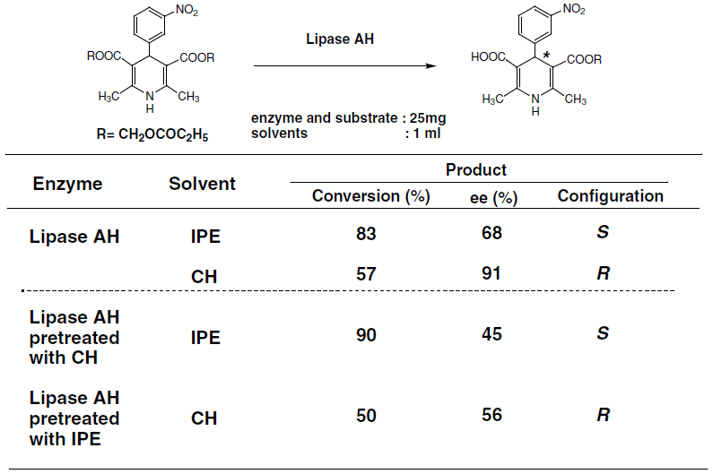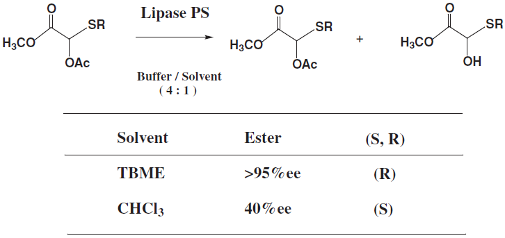 リパーゼは表面を構成するアミノ酸に疎水性のアミノ酸が多いことから、有機溶媒に対する親和性があり、一般の有機反応で使用される有機溶媒中で使用できる特徴がある。これが理由でリパーゼの利用が広がったといっても過言ではない。酵素の利用から見れば使用できる条件の拡大として大きな特徴ではあるが、逆に、化学触媒から考えれば有機溶媒中の反応はなじみのある反応の場である。すなわち、酵素という触媒を本来酵素が得意としない化学触媒が得意とする反応の場で、その能力を競うことになるのである。リパーゼも他の酵素と同じくアミノ酸からなるタンパク質であり、基本的には水系での反応が有利なのである。しかし、基質となる化合物が水に溶けないものであることから、不利な環境での競争とならざるを得ないのかも知れない。