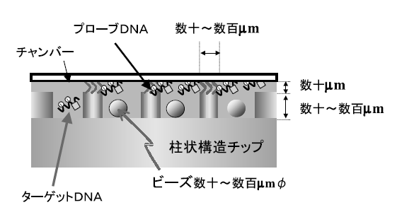 一般的にDNAチップでは、反応時にターゲット溶液中のDNA の拡散が遅く (~200μm19))、希薄な溶液を用いた場合や低発現の遺伝子を検出しようとした場合、十分な反応効率が期待できない。そこで、反応時にターゲットDNAの拡散を物理的に加速するコンセプトで検討を進めた。その結果、ビーズによる攪拌を考案し、上述の柱状構造、表面のナノレベルの設計と組み合わせることにより、プローブDNAには何等影響を与えることなく効果的に反応を促進できる技術を開発した (図3)。