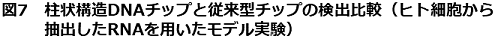 上述のとおり、今回開発した合成樹脂からなる柱状構造チップでは、表面加工・修飾の自由度が高く、柱状構造の上端面のナノレベルの設計を行うことによりDNAとの相互作用を制御する技術が開発できる。その結果、ターゲットDNAとのハイブリダイゼーション効率が最も良好な密度でプローブDNAを固定させることに成功している。また、DNAとの結合様式を種々設計できることを利用して、非特異なDNAの吸着抑制に有効な表面を実現している。これらの表面設計技術は、シグナルを向上させるとともにノイズレベルを低減させ、検出感度向上に有効である。
