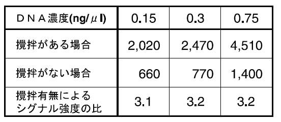 すなわち、図4に示すように、ハイブリダイゼーション時にターゲットDNAと一緒に直径数十~数百μmの大きさのビーズをチャンバー内に封入してチップ全体を振とうし、ビーズを動かしてハイブリダイゼーション液の攪拌を行う。このようにハイブリダイゼーション液を攪拌することにより、静置時に比べて効率的にターゲットDNAをプローブDNAと会合でき、ハイブリダイゼーションを格段に加速し、シグナル強度を大幅に向上できる (表1)。また、スポット間の反応均一性およびスポット内の反応均一性も格段に向上させることに成功した (図5)。この時、プローブDNAがスポットされている柱状構造の上端面とカバーグラスの間にビーズが侵入しないような設計を行うことにより、プローブDNAが傷つけられることはない。
