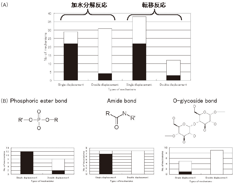 加水分解反応では、リン酸エステル結合、アミド結合、O-グリコシド結合が主要な標的共有結合となっている。したがって、こうした結合に対しては、触媒機構の種類も数多く存在している。図2Bに示すように、リン酸エステル結合とアミド結合の加水分解では、類似の傾向を示すのに対して、O-グリコシド結合の加水分解反応は、全く異なる挙動を示している。例えば、リン酸エステル結合とアミド結合の加水分解では、single displacement 機構では殆どの場合マグネシウムイオンや亜鉛イオンのような補因子が使われるのに対し、double displacement機構では殆ど使われない。それに対して、O-グリコシド結合の加水分解反応では、single displacement機構でも、殆どそのような補因子が使われない。こうした傾向の違いは、リン酸エステル結合とアミド結合がエステル結合であるのに対して、O-グリコシド結合は、非エステル結合であることを反映している可能性がある4)。