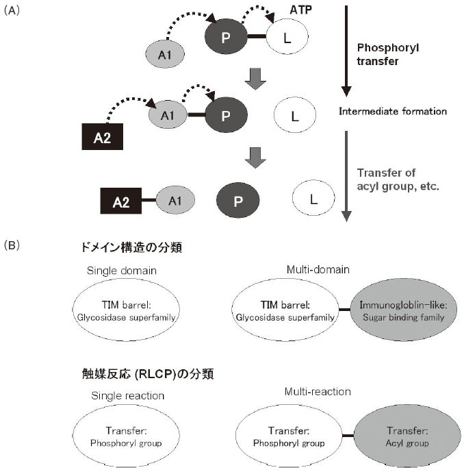 殆どの加水分解反応や転移反応は、それぞれ加水分解酵素 (E.C. 3.-.-.-) や転移酵素 (E.C. 2.-.-.-) に触媒されるが、リガーゼ (E.C. 6.-.-.-) など他の酵素類が、こうした反応を触媒することもある。図3Aに示すように、リガーゼ類の多くは、2つの転移反応を次々と触媒している。例えば、グルタチオン合成酵素 (E.C. 6.3.2.3) の場合、ATP からアシル基にリン酸基を転移し、そのアシル基をリン酸基から別の受容基に転移する10,11)。この酵素の活性部位の構造を観ると、リン酸転移酵素の一つであるHPP キナーゼ (E.C. 2.7.6.3) の活性部位12)とアシル転移酵素の一つであるヒストン・アセチル転移酵素 (E.C. 2.3.1.48) の活性部位の構造13)の特徴を併せ持つことが分かる4)。上記のRLCP分類では、グルタチオン合成酵素のような酵素には、2種類の反応分類のクラスが割り当てられている3,4)。