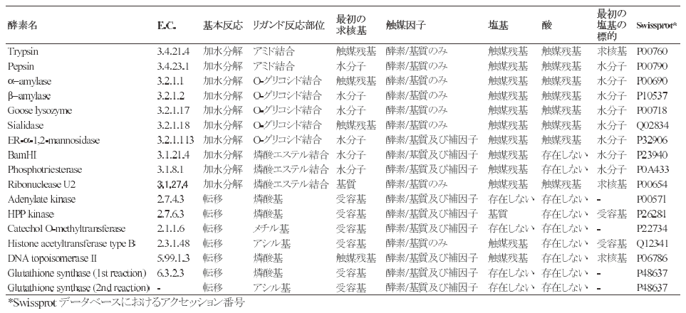 図1に示すように、加水分解反応、転移反応は、いずれも置換反応の組み合せであり、必ず1つ以 上の求核基が存在し、加水分解の場合、そのうちの一つは、水分子である。加水分解反応、転移反応は、いずれも次の2種類に大別できる。求核基が1つしかないsingle displacement 機構と2つの求核基が存在するdouble displacement機構である。加水分解反応の場合、single displacement機構では、水分子が直接、標的となる共有結合を求核攻撃し、反応が終結する。ペプシン5)、β-アミラーゼ6)などの触媒機構が、single displacement 機構に分類できる。それに対して、double displacement 機構では、まず、触媒残基か基質のある部位が最初の求核基として標的の共有結合を求核攻撃し、新しい共有結合をもつ中間体を形成する。次のステップで、水分子がこの新しい結合を求核攻撃することで加水分解反応が終結する。トリプシン7)、α-アミラーゼ8)などの触媒機構が、double displacement機構に分類できる。更に、図1に示すように、これらの触媒機構を更に多様化させる触媒因子 (塩基、酸、補酵素など) が多数存在しており、触媒反応を促進している。ここで、触媒機構を、触媒因子や基質の間の分子内、分子間ネットワークとして捉えることができることが分かる。こうした触媒因子やそれらの標的因子をアノテーションすることによって加水分解反応の触媒機構は記述でき、相互に比較することができる (表1)。