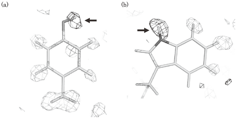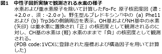 一方、中性子は各原子の原子核と相互作用し散乱を受けるため、その散乱の度合いは原子番号によらず、個々の原子の性質に由来する。表1から水素原子による中性子の散乱効果は、他の元素と遜色ないことがわかる (それぞれの値を自乗した値が、各原子の観測のしやすさを示す目安である)。このように、中性子は「 (炭素や酸素原子と同じように) 水素原子を観測できる」という特徴を有している。さらに、中性子の水素原子からの散乱は「負」の値を示しているため、観測される原子核密度の分布によっても他の原子と明確に区別できる。また、中性子は「同位体を識別できる」という特徴も有しており、重水素原子は「正」の散乱値を有している。タンパク質結晶を重水溶液に浸漬させることにより、水素原子の存在環境の違いを「正」および「負」の原子核密度として明確に区別できる (図1)。また、水素原子の重水素原子への置換は、回折強度測定の際のバックグラウンド強度軽減という観点で非常に重要であるが、これについては後述する。
