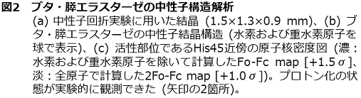 最近、我々は代表的なセリンプロテアーゼの一つであるブタ・膵エラスターゼの大型結晶をマクロシーディングを繰り返すことにより作成し (図2a)、2.3 Å分解能の中性子回折データの収集に成功した8)。現在、構造精密化中であるが、これまでに全原子の半分に相当する約1,700個の水素および重水素原子を確認済みで (図2b)、活性部位の電荷リレーシステムを構成する残基であるHis45のプロトン化の状態を確認している (図2c)。先に述べたようにX線回折法では、水素原子の観測のために1Åを超える高い分解能の回折データが必要である。しかしながら中性子回折では2.0Å台前半の分解能でも水素原子 (この場合は解離基の水素は重水素に置換されている) の存在を確認することができる。このように、中性子構造解析は従来のX線解析では困難であったによる触媒基の解離状態の観測を可能にする。この直接観測により、既知の酵素の触媒機構をより正しく理解することができるのはもちろん、反応機構が詳しく解明されていない新しい酵素の触媒機構の解明についても大変重要な情報が得られる。