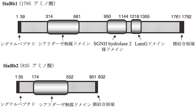 もう一つのシアリダーゼSiaBb2はSiaBb1の遺伝子のおよそ半分ほどの長さの遺伝子を持つタンパク質で835アミノ酸残基からなり、N-末端側にシグナルペプチド、C-末端側に膜結合領域を持つ。中間には触媒ドメインしか存在せず、やはりGH family 33に属する糖質分解酵素と相同性があった。SiaBb1の触媒部位との相同性は70%以上であった。SiaBb2はSiaBb1に比べて著しく高い熱安定性を示した。また、SiaBb2はSiaBb1のシアリターゼ触媒ドメインと基本的に同様な構造を持つ酵素であると考えられる。