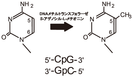 DNA中のシトシン塩基は生理条件下でメチル化修飾を受ける。1948年にHotchkissは仔ウシ胸腺に含まれるDNA塩基を薄相クロマトグラフィーで分析し、A、G、C、T以外にCの修飾塩基が含まれることを見出し、これが5-メチルシトシン (5mC) であると予想した。1951年にはWyattは動物組織や植物組織のゲノムの塩基分析で5mCが含まれていることを証明した。その後、5mCは原核生物である細菌ももっていることが明らかになり、真核生物では菌類から高等植物、哺乳類までほとんどの生物のゲノムに5mC修飾が見つかっている。例外的に、線虫や出芽酵母のゲノムに5mCは存在しない。脊椎動物では、CとGの順に並んだCpG配列があると、DNAメチルトランスフェラーゼはシトシン塩基の5位の炭素にS-アデノシル-L-メチオニンからメチル基を転移、付加する (図1)。