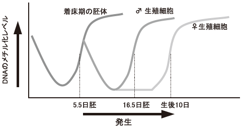マウスなど哺乳類のゲノム全体のメチル化レベルは、組織が分化してしまうと比較的一定であるが、胚発生、生殖細胞の成熟過程で大きく変動する4)(図2)。これに対して、アフリカツメガエルやゼブラフィッシュなどの非哺乳類の脊椎動物では、限定された範囲の遺伝子領域では、細胞の分化にともなってDNAのメチル化状態は変化するものの、初期発生の過程でゲノム全体のメチル化レベルが大きく変化することはない。