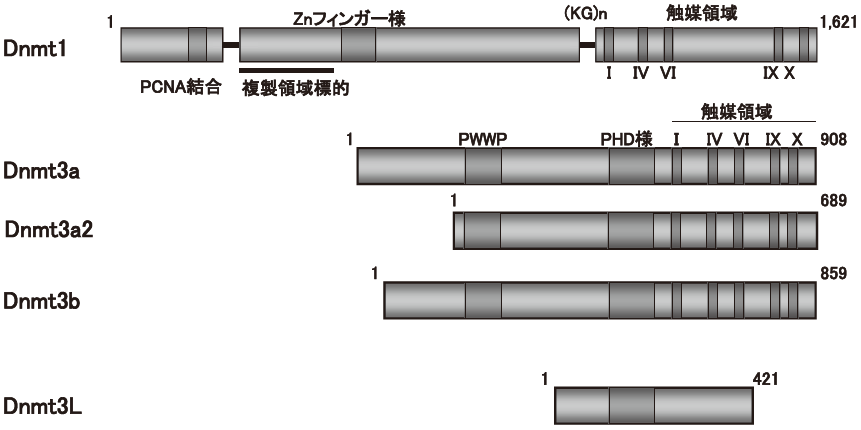 マウスDnmt1は1,621アミノ酸残基からなる大きな分子で、分子内を、機能的、エキソン配置、構造的な基準から3つの部分に分けることができる (図3)。