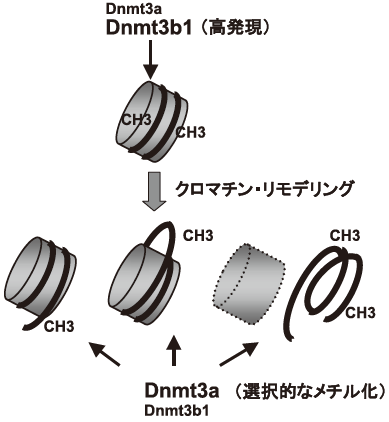 Dnmt3aとDnmt3bは、生体内では一部ゲノムの異なる領域をメチル化しているが、in vitro で裸の2本鎖DNAを基質とした場合はお互いによく似たDNAメチル化活性を示す8,17)。しかし、生体内でDNAが組み込まれているヌクレオソームをメチル化受容基質として両酵素の活性を比較すると、両者の違いは際立つ。両酵素ともヌクレオソームの形成によって活性が著しく阻害されるが、Dnmt3bがヌクレオソームのコア領域をある程度メチル化できるのに対して、Dnmt3aはその活性が著しく低い。一方、Dnmt3aはヌクレオソーム内でDNAが裸で露出している領域を効率よくメチル化する。Dnmt3bの発現量が時期や細胞特異的に厳密に調節されているのに対して、Dnmt3aは、発現量は低いものの様々な細胞でユビキタスに発現している。発生期での発現のタイミングや、生殖細胞で見られた組織特異的な発現様式の違い、それとヌクレオソームDNAをメチル化する活性の違いが総合されることで、両酵素がゲノムの異なる領域をメチル化していると考えられる18)。Dnmt3bが主に繰り返し配列を含むゲノム・ワイドな領域のメチル化模様の形成に、そして、Dnmt3aが特定領域のDNAメチル化に寄与していると考えたい (図4)。