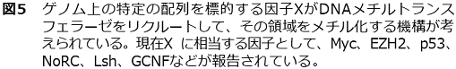 癌遺伝子であり転写因子でもあるc-MycはDnmt3aのCys残基に富むPHD (plant homeodomain) 様配列に結合して、Dnmt3aをp21Cip1遺伝子のプロモーター領域にリクルートし、付近のメチル化を誘導して、p21Cip1遺伝子の発現を抑制することが報告されている27)。また、維持型のメチル化酵素であると考えられているDnmt1がp53の標的配列にリクルートされて、その付近をメチル化することが報告されている16)。クロマチン・リモデリング複合体NoRCはリボソームRNA遺伝子の転写抑制に寄与するが、その構成因子Tip5はDnmt1とDnmt3bをリクルートして遺伝子のサイレンシングに貢献しているなど28)、DNA配列特異的に結合する因子がDNAメチルトランスフェラーゼをリクルートして、メチル化する領域を規定する機構が報告されてきている。同様の機構が今後さらに報告され、DNAメチル化模様の調節に重要性を増すものと予想される (図5)。