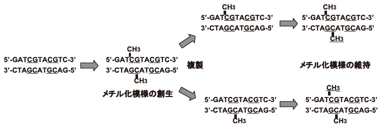 DNAのメチル化修飾がエピジェネティックスの定義を満たすのは、その模様が次世代の細胞に伝えられる機構があることによる。ゲノムに形成されたメチル化模様が次世代の細胞に維持されるのは、最初にcDNAが単離されたDNAメチルトランスフェラーゼDnmt1の働きによる。Dnmt1はDNA複製やDNA修復直後に生じる2本鎖DNAに存在する、片方がメチル化されたCpG対 (ヘミメチル化DNA、図6) を選択的にメチル化して、DNAメチル化模様を細胞系列特異的に維持している。Dnmt1遺伝子のノックアウト・マウスでは、着床後にゲノム全体に起きるメチル化修飾の時期にメチル化インプリントの消失や不活性X染色体の再活性化が引き起こされ、胎生9.5日で致死となる。